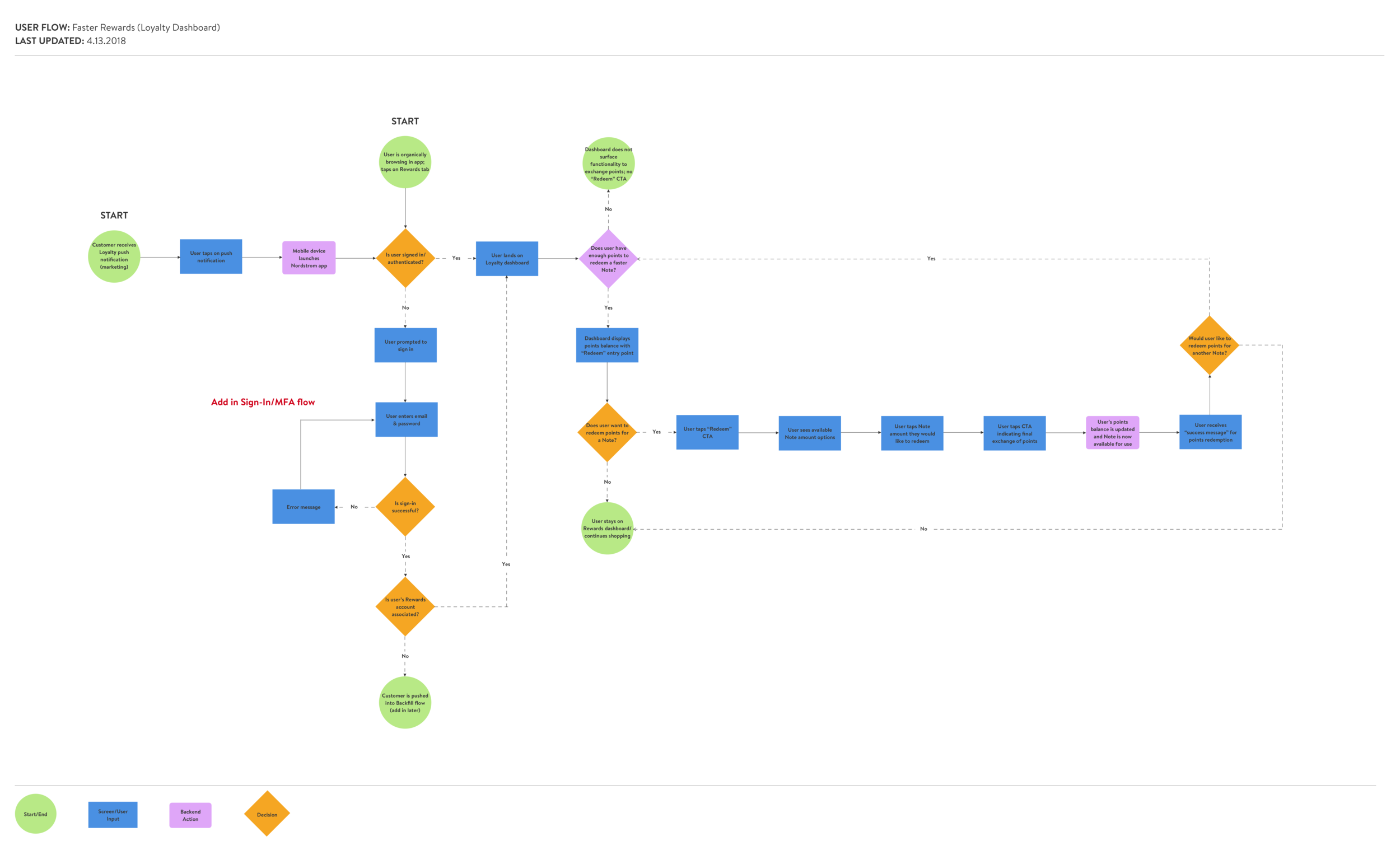 One of the main features that we are focusing on marketing to customers and pushing for them to use is Faster Rewards — allowing customers to trade in points for smaller increments of Notes instead of having to earn 2,000 points and be auto-issued a $20 Note like in the old program. This creation of this feature is in response to the constant feedback we have received from customers: it is too difficult to earn a Nordstrom Note and they don’t hold a lot of value because they aren’t easily accessible for a majority of customers. So, before designing to a dashboard that this feature will live in, it was important to create a user flow to understand how a customer would use Faster Rewards.